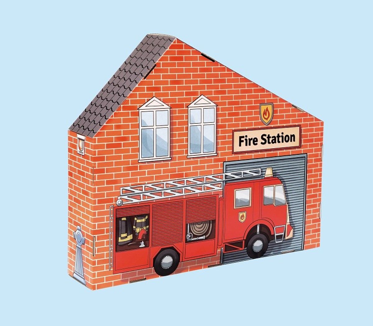 Kartonová hasičská stanice s hořícím domečkem a figurkami hasičů. Děti si procvičí jemnou motoriku, rozvinou kreativitu a zabaví se. Stanice je ze 3 vrstev vlnitého kartónu s tematickým potiskem.