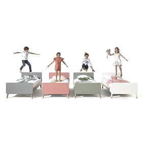 Stylová dětská postel bez zábrany v univerzálním bílém provedení. Šikmé nožičky se zlatým efektem dodávají posteli retro nádech. Součástí postele je lamelový rošt.