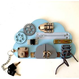 Originální dřevěná hrací deska ve tvaru modrého mráčku, se kterou si děti zábavným způsobem procvičí motorické dovednosti, kreativitu, logické myšlení a také soustředění.