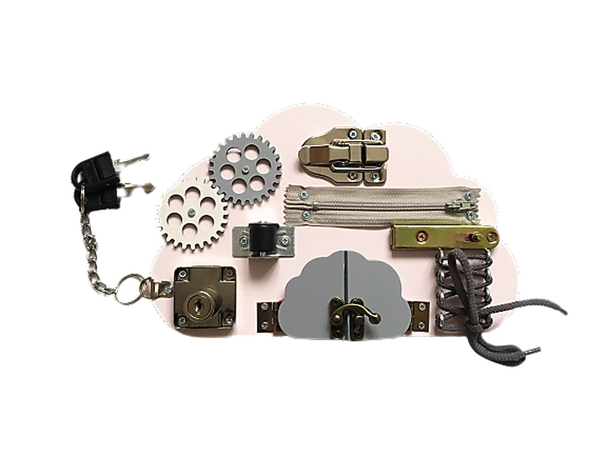 Originální dřevěná hrací deska ve tvaru růžového mráčku, se kterou si děti zábavným způsobem procvičí motorické dovednosti, kreativitu, logické myšlení a také soustředění.