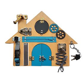 Originální dřevěná hrací deska modré barvy ve tvaru domečku, se kterou si děti zábavným způsobem procvičí motorické dovednosti, kreativitu, logické myšlení a také soustředění.