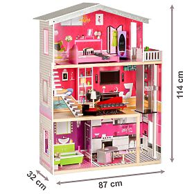 Dřevěný domeček pro panenky je splněným snem každé malé slečny. Vila Kayla nabízí spoustu možností a je vyrobená z kvalitního dřeva bez ostrých hran. Sestává ze tří pater a čtyř pokojů s terasou. Jako bonus najde vaše malá princezna v domečku i jednu panenku o velikosti 28 cm.