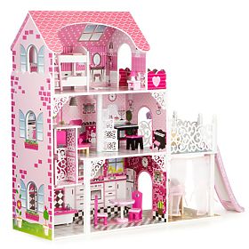 Tento nádherný dřevěný domeček Viktorie zajisté potěší každou mladou slečnu. Sedm pokojů, tři patra, pohyblivý výtah a dřevěný nábytek zaručují hodiny zábavy a vyžití.