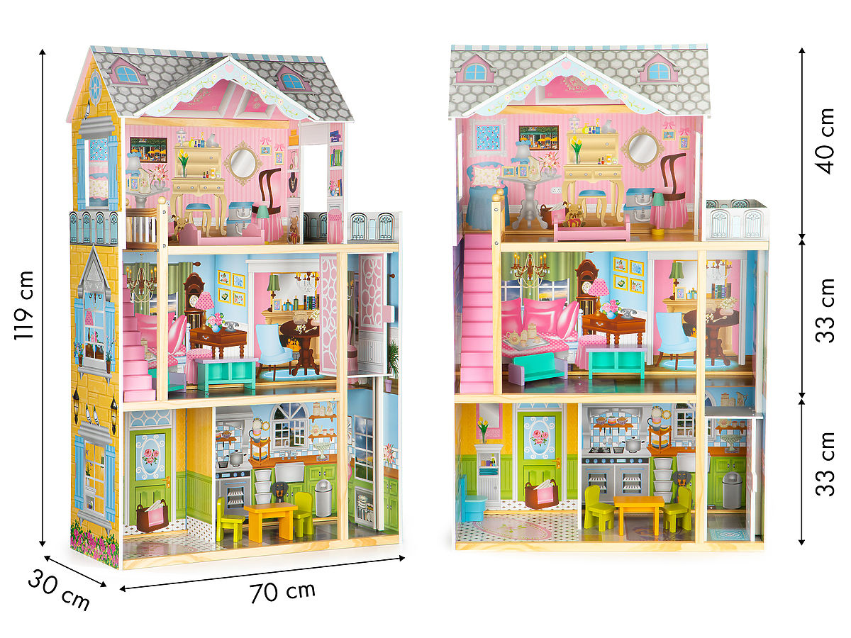 Tento nádherný dřevěný domeček Melissa zajisté potěší každou mladou slečnu. Čtyři pokoje, tři patra, pohyblivý výtah a dřevěný nábytek zaručují hodiny zábavy a vyžití.