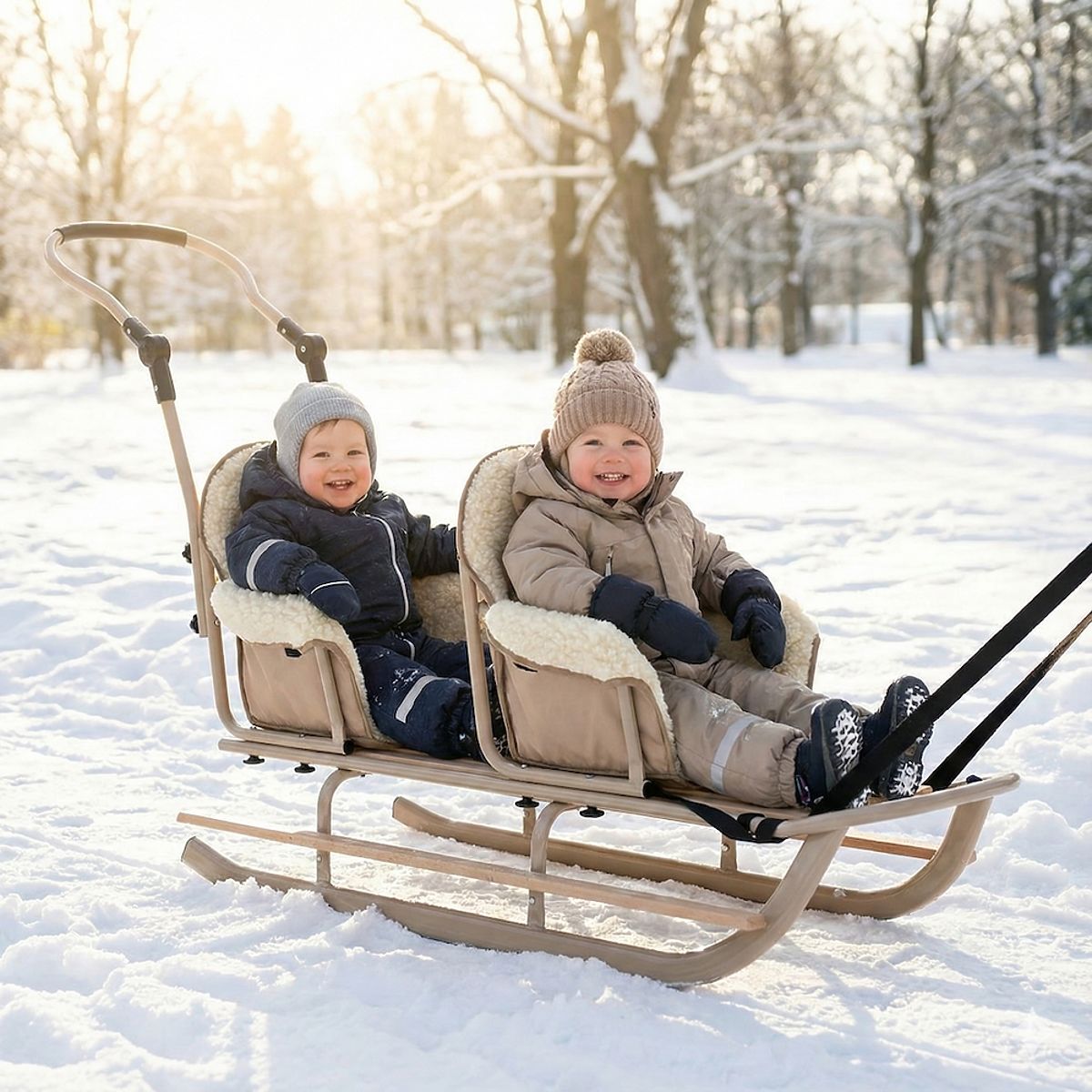 Univerzální béžová konstrukce sáněk se skvěle hodí jak pro holčičky, tak i pro chlapečky.
