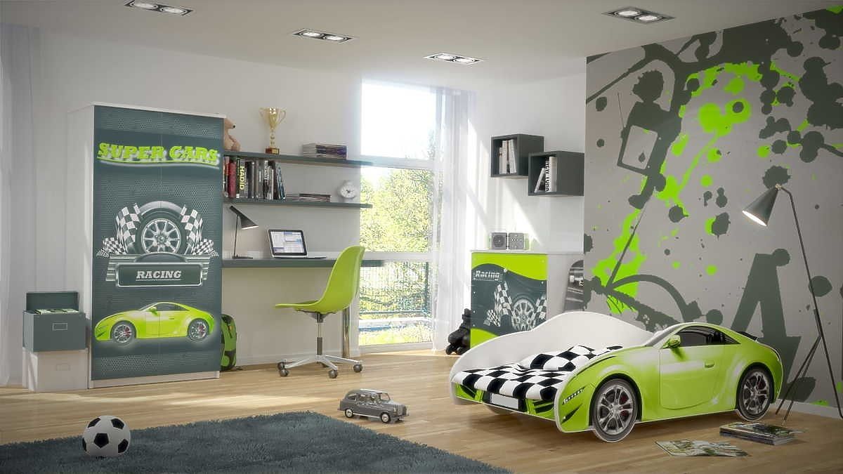 Touto parádní dětskou postelí ve tvaru auta splníte sen každému malému závodníkovi. Postel je vyrobena z kvalitní dřevotřísky a je zdobená krásným zeleným potiskem z ekologických barev.