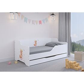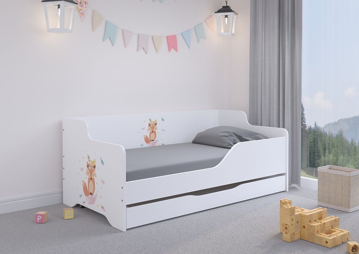 Dětská postel Lilu ve tvaru pohovky s potiskem roztomilé lišky o rozměrech 160 x 80 cm. Tento praktický a velice účelný model postele je známý jako postel se zády. V noci klasické lůžko a přes den pohodlná pohovka.