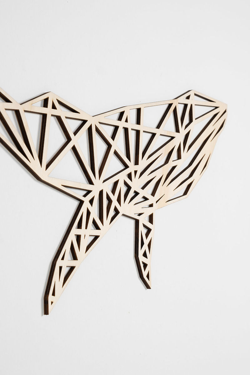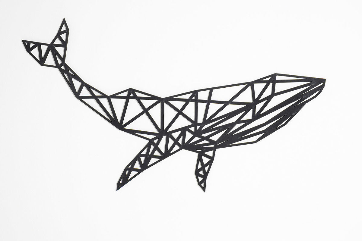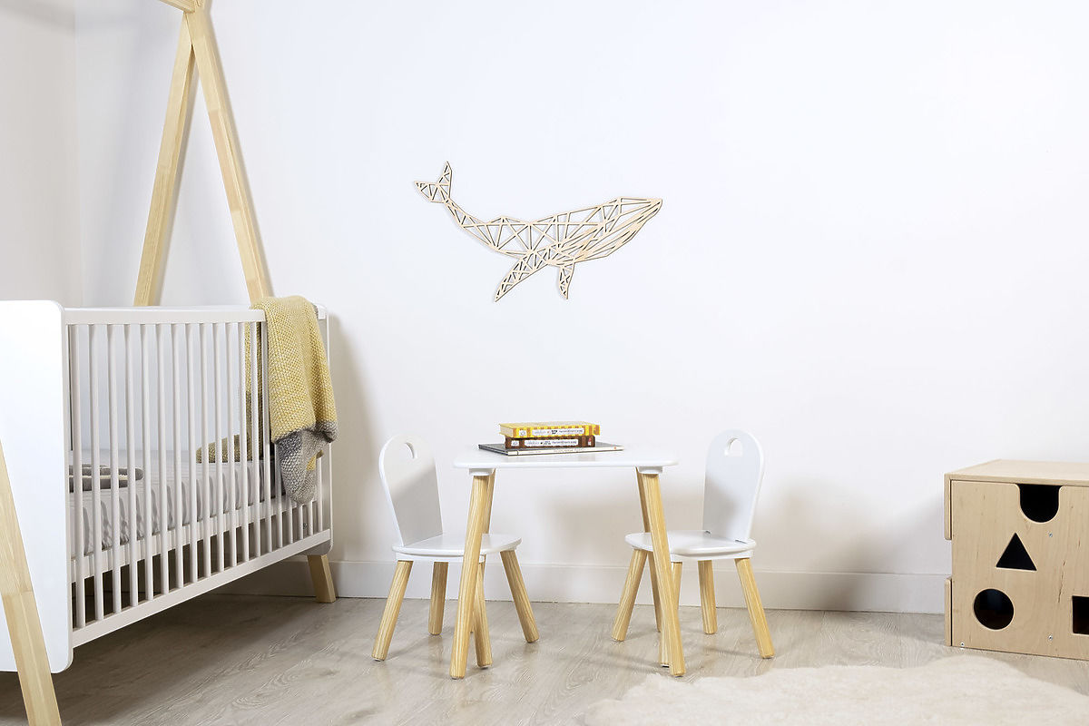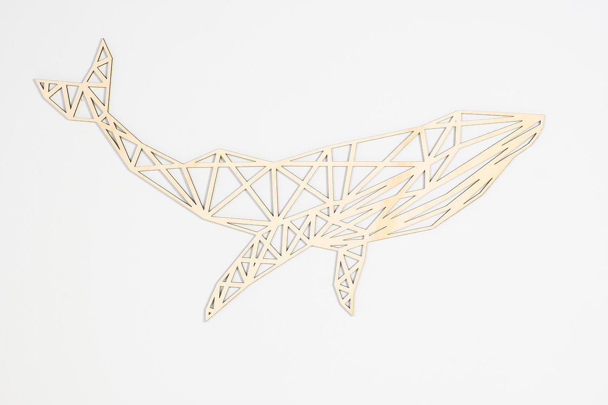 Dřevěný geometrický obraz ve tvaru Velryby. Závěsná dekorace z překližky je vhodná do dětského pokoje ve skandinávském stylu.