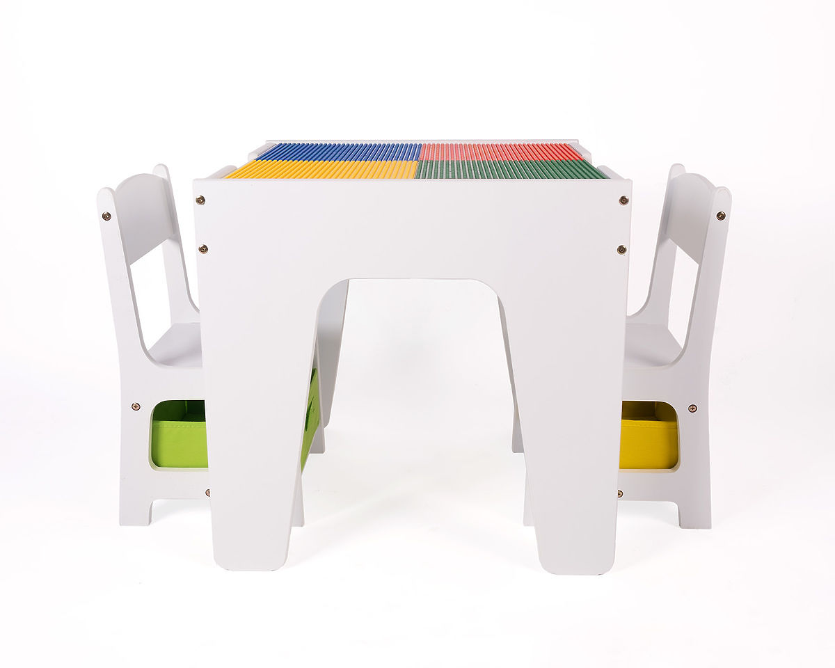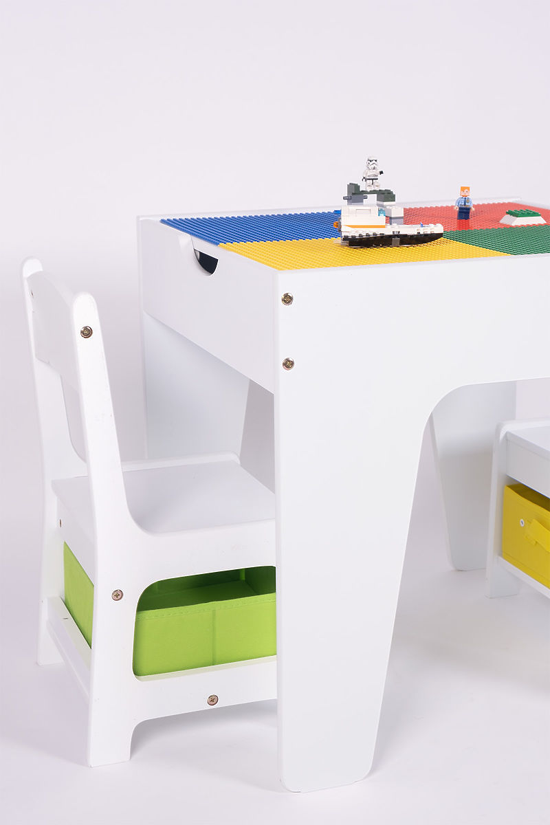 Deska stolu se skládá ze dvou odnímatelných oboustranných částí. Z jedné strany jsou desky přizpůsobené ke stavění lega (classic, duplo*), druhá strana je klasická rovná plocha na kreslení, malování a další kreativní činnosti.