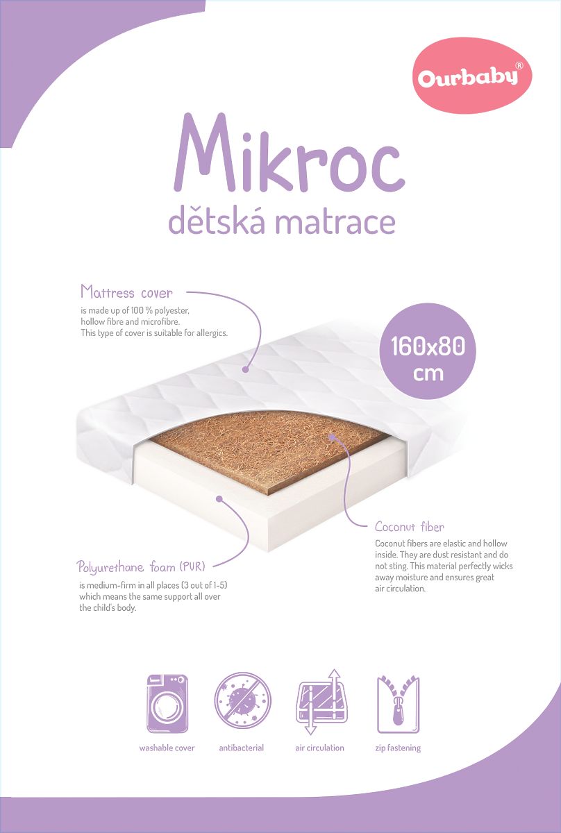 Dětská matrace MikroC o rozměru 80x160 cm patří k oboustranným matracím, které dětem dávají možnost volby mezi měkčí a tužší stranou. Měkčí strana je z PUR pěny a tužší stranu tvoří deska z kokosových vláken. Matraci ocení jak předškoláci, tak starší děti.