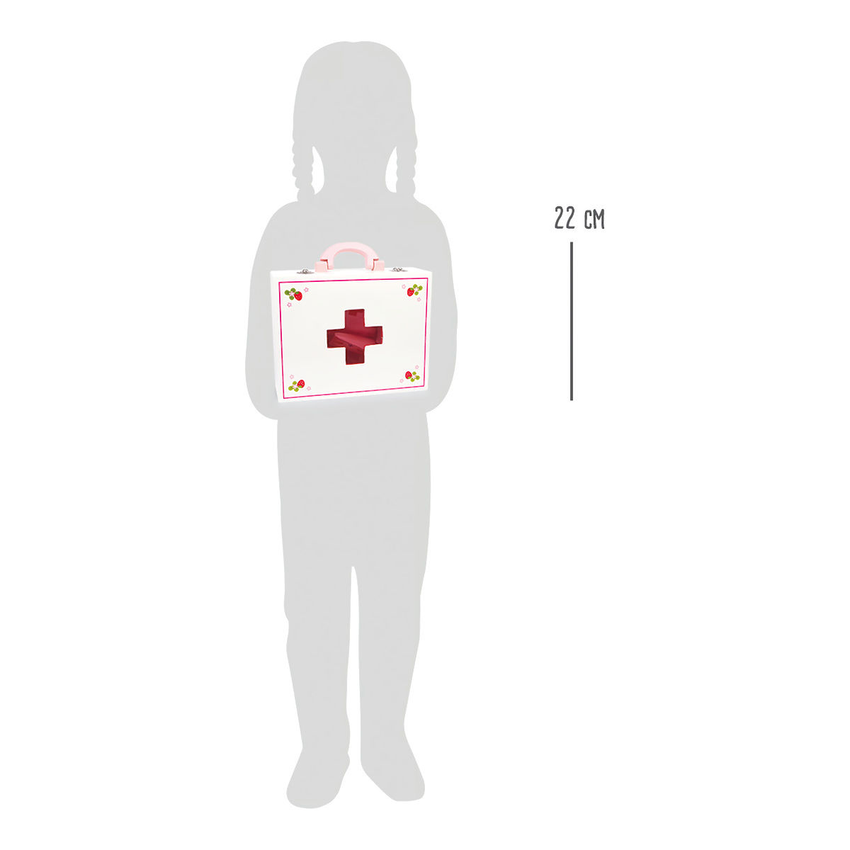 Dřevěný barevný kufřík pro malou ošetřovatelku obsahuje 24 kusů různobarevného dřevěného příslušenství včetně textilní čelenky s červeným křížem. Kufřík obsahuje vše co každý doktor potřebuje - teploměr, stetoskop, injekční stříkačku, masti, léky... Vše vyrobené ze dřeva. Motiv jahody na jednotlivých nástrojích doplňuje veselý design.