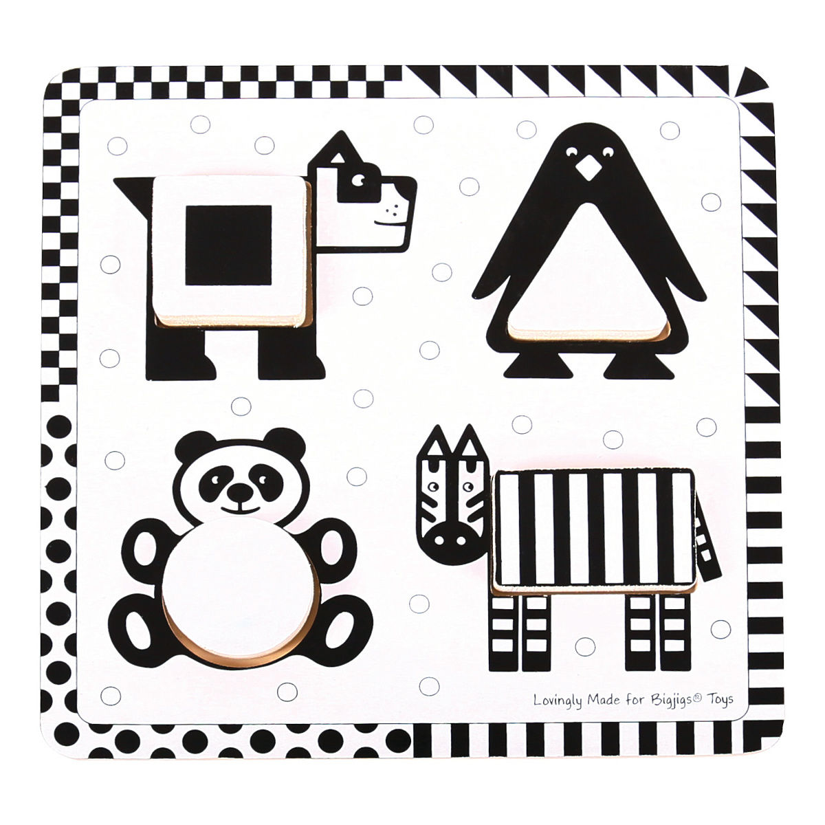 Toto dřevěné puzzle bylo speciálně navrženo v černé a bílé barvě, protože černá a bílá jsou pro nejmenší děti nejsnáze rozeznatelné a reagují na ně. Každý ze čtyř dílků puzzle lze zasunout do místa na desce s ilustrací zvířat a pomůže vašemu dítěti ve vývoji, když se naučí každý z nich identifikovat a umístit. Každý masivní dřevěný dílek puzzle má velkorysou velikost, aby ho malé ručičky snáze zvedly, uchopily, prozkoumávaly a vyměňovaly. Pomáhá rozvíjet zručnost, smyslové dovednosti a koncentraci. Vyrobeno z vysoce kvalitních, zodpovědně získaných materiálů. Splňuje aktuální evropské bezpečnostní normy. Obsahuje 4 dílky puzzle.. Hlavní vlastnosti: speciálně navrženo pro nejmenší dětiobsahuje 4 dílky puzzlerozvíjí zručnost, smyslové dovednosti a koncentraci