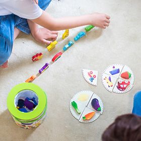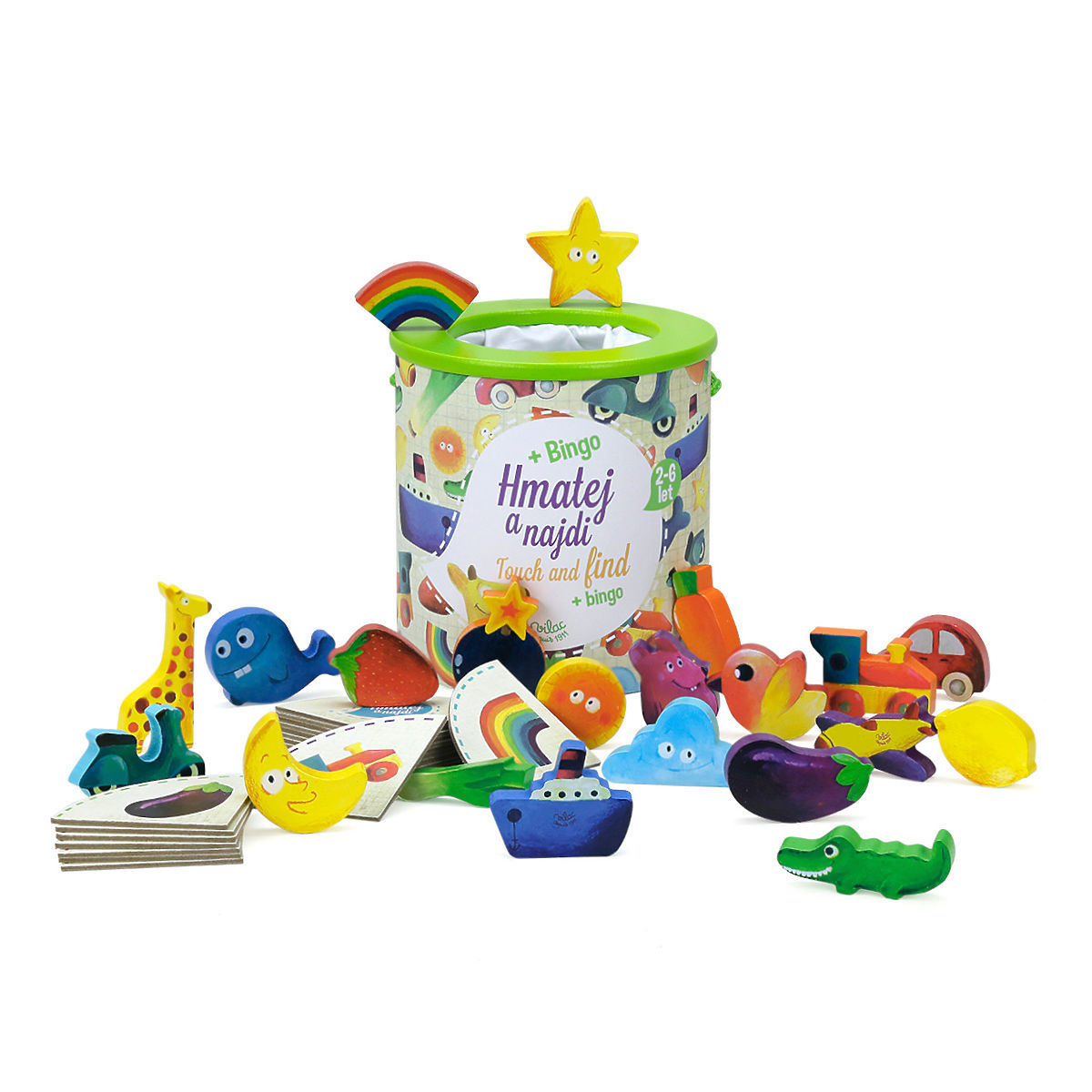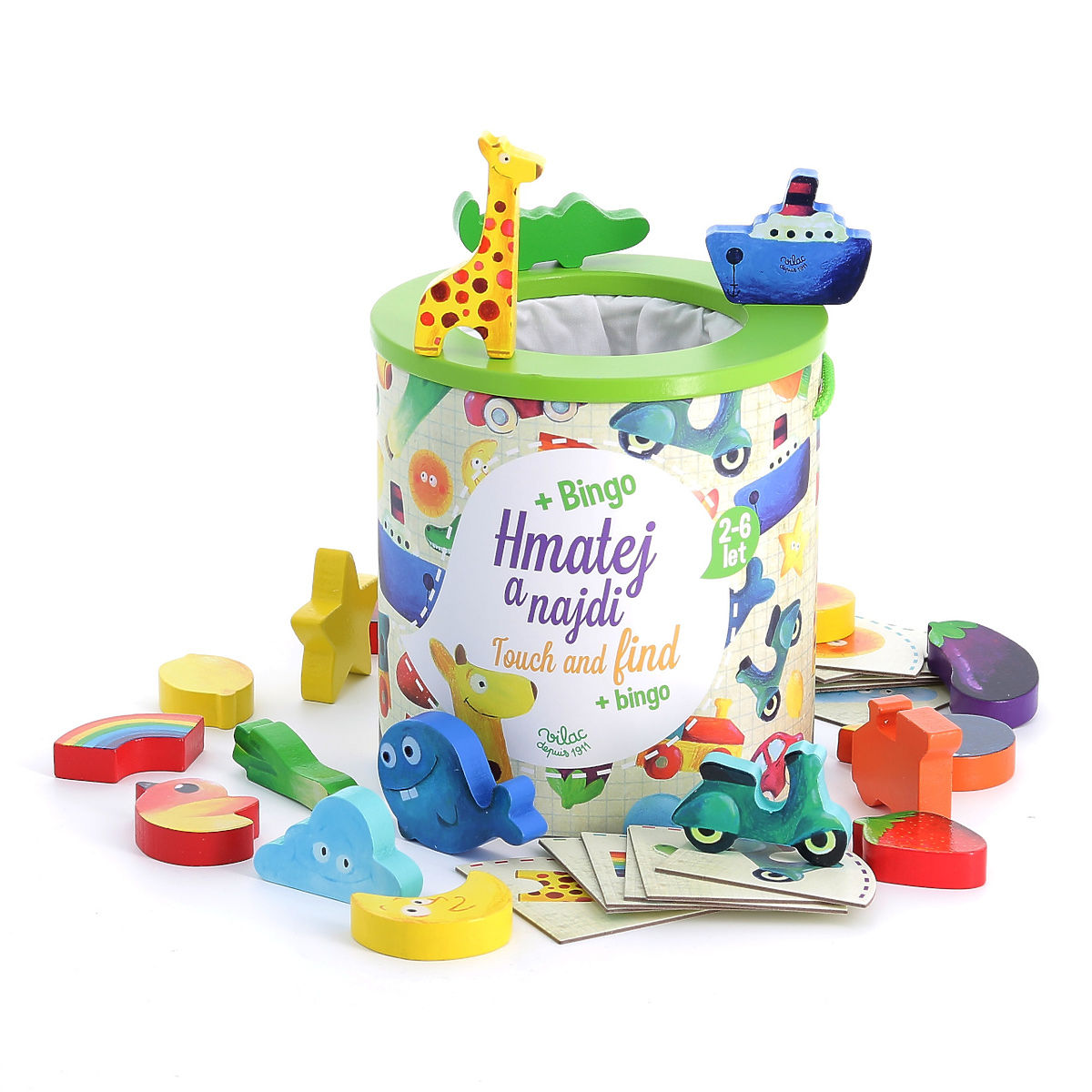 Nepřekonaný bestseller Vilac se originálním způsobem snaží rozvíjet často opomíjený smysl dětí, hmat. Hra je tvořená zejména dřevěnými figurkami ukrytými v kyblíku vybaveném uvnitř jemným látkovým sáčkem. Menší děti mají za úkol po vložení ruky do tuby jen na základě hmatání popsat svými slovy, jaký předmět drží v ruce. Rodiče mohou postup dětem předvést názorným příkladem. Starší děti mohou hrát hru ve formě lota, nebo binga, k těmto hrám jsou v sadě k dispozici obrázkové karty jednotlivých předmětů. Hlavní vlastnosti:21 herních dílků a 20 obrázkových karetpro 2–5 hráčůrůzné herní variantypraktické balení Návod ke hře: Hmatej a najdi: První hráč si vezme kartu z hromádky. Poté musí sáhnout do sáčku a podle hmatu najít dřevěný dílek, který odpovídá obrázku na kartě. Pokud vybere správný dílek, kartu si ponechá a na řadě je další hráč, který opět začíná tažením karty z hromádky. Pokud ale první hráč vybere nesprávný dílek, musí svou kartu předat dalšímu hráči, který se musí pokusit najít správný dílek. Po každém kole se dílky vrací zpět do sáčku. Když už na hromádce nezbývá žádná karta, určí se vítěz. Vítězí hráč s největším počtem karet. Pozor! Pokud jeden z hráčů náhodou vytáhne dílek ve tvaru bomby, musí všechny své karty vrátit na hromádku! Pravidla můžete upravit dle vlastního uvážení, aby se děti lépe seznámily s hmatáním a hledáním předmětů: 1 – Začněte s malým množstvím dřevěných dílků. 2 – Dovolte dětem podívat se do sáčku. 3 – Poté hru opět udělejte o něco těžší, nedovolte jim nahlížet do sáčku. 4 – Přidejte do sáčku více dílků. 5 – Nakonec, až si děti na hru zvyknou, hrajte podle tradičních pravidel. BINGO varianta: Rozložte 4 karty do čtverce a vytvořte jedno, nebo více hracích polí pro každého hráče. Jeden z hráčů, nebo rodič vytáhne dílek ze sáčku a vyvolá ho. Hráč, který má kartu odpovídající tomuto vyvolanému dílku, si jej vezme a položí na svou kartičku. Vítězí hráč, který jako první zaplní své herní pole! Dokumentace:Návod ke hře Hmatej a najdi (CZ)Návod ke hře Hmatej a najdi (SK)