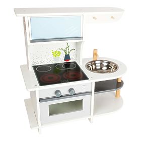 Chtějí být Vaši nejmenší kuchaři a kuchařkami, vařit jako dospělí, pečovat a cítit se stejně užitečně? Hrou mohou rozvíjet nejen fantazii, ale také řadu užitečných dovedností. Kompaktní kuchyňka Graceful je vhodná do omezených prostor. Nabízí vyjímatelný plechový dřez, který lze naplnit vodou a děti v něm mohou mýt nádobí jako ve skutečnosti. Multifunkční sporák je vybaven troubou s dvířky opatřenými magnetickým zavíráním a velkým průhledem. Troubu lze využít jako praktický úložný prostor, kde své místo snadno nalezne řada příslušenství a hraček. Knoflíky ovládání spotřebičů otáčením vydávají cvakavé zvuky a hra je díky nim ještě uvěřitelnější. Nad sporákem pak naleznete skříňku, do níž mohou děti ukládat makety potravin, nádobí a náčiní. K dispozici jsou i další odkládací police a háčky. Kuchyňka je dodávána se základní sadou příslušenství, díky kterému je hned připravena ke hře. Robustní a odolná dřevěná konstrukce zajišťuje dlouhou životnost nabitou mnoha rozmanitými zážitky. Výrobek vyžaduje montáž, dodáváno s obrázkovým návodem k sestavení. Hlavní vlastnosti:kuchyňka, hrnec s pokličkou, pánev, nůž a obracečkavyjímatelný kovový dřez, dvířka trouby s magnetickým zavíránímrozmanité úložné prostory a odkládací plochyzvukové efekty ovládání spotřebičůrobustní a odolné dřevěné provedení