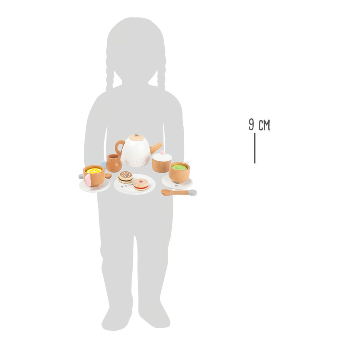 Překvapí Vás pečlivým zpracováním z masivního dřeva, součásti jsou robustní a zvláště přizpůsobené dětským ručkám. Přírodní materiál dovedně přiznává a hravě kombinuje s jemnými pastelovými odstíny. Provedení klade důraz na detail, víčka konvičky i cukřenky jsou proto odnímatelná a hra může být ještě uvěřitelnější. Sadou můžete vhodně doplnit dětskou kuchyňku, stánek, nebo makety dezertů.