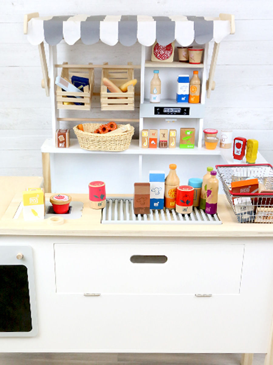 Týdenní nákup potravin bude díky tomuto setu rychlovka! Najdete zde pomerančový džus, dvě balení zmrzliny, balení hrášku, rybí prsty, máslo, sýr, krájenou salám a krabici mléka, 9 dílná souprava vám splní všechna přání. Děti si se sadou opravdu vyhrají. Nejprve "nakoupí" a pak uloží potraviny do své dětské kuchyně nebo prodejního stánku. Hračka je vyrobena z pevného dřeva, takže slibuje dlouhotrvající kvalitu.
