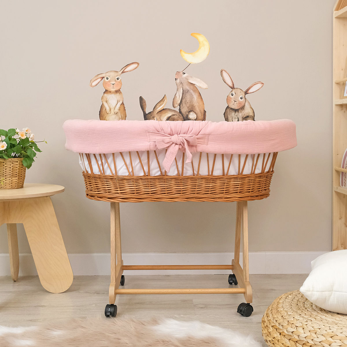 Tento proutěný košík vytvoří dokonalé a útulné místo na spaní pro vaše miminko kdekoliv v domě. Součástí košíku je 4-dílná sada povlečení s výplní mušelínu, plněné antialergickým silikonovým rounem. Vzdušné a na dotek měkké mušelínové povlečení minimalizuje možnost přehřátí a zajišťuje dostatečnou cirkulaci vzduchu. Polštář je zdobený ušima, má prohlubeň na hlavičku Vašeho miminka. Textilie jsou jemné na dotek.