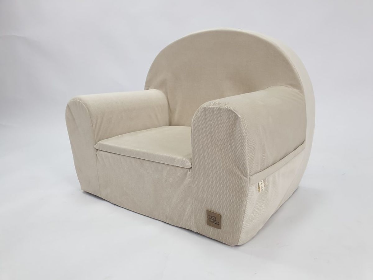 Béžové křesílko Velvet pro děti, které již mohou samostatně sedět. Křeslo je kromě krásného vzhledu mimořádně funkční. Odnímatelný potah umožňuje kdykoliv snadné vyprání. Má boční kapsu, která se skvěle hodí pro schování dětského pokladu nebo oblíbené dětské knížky.