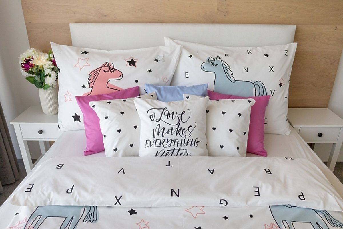 Dětské bavlněné povlečení s poníky, nadchne nejednu malou milovníci malých koníku. Ručně malované poníky doplňují barevné a černé hvězdičky. Spodní strana povlečení je posetá černými písmenky. Jednoduchý vzhled podpoří dětskou fantazii a dodá prostor pro jejích snění.