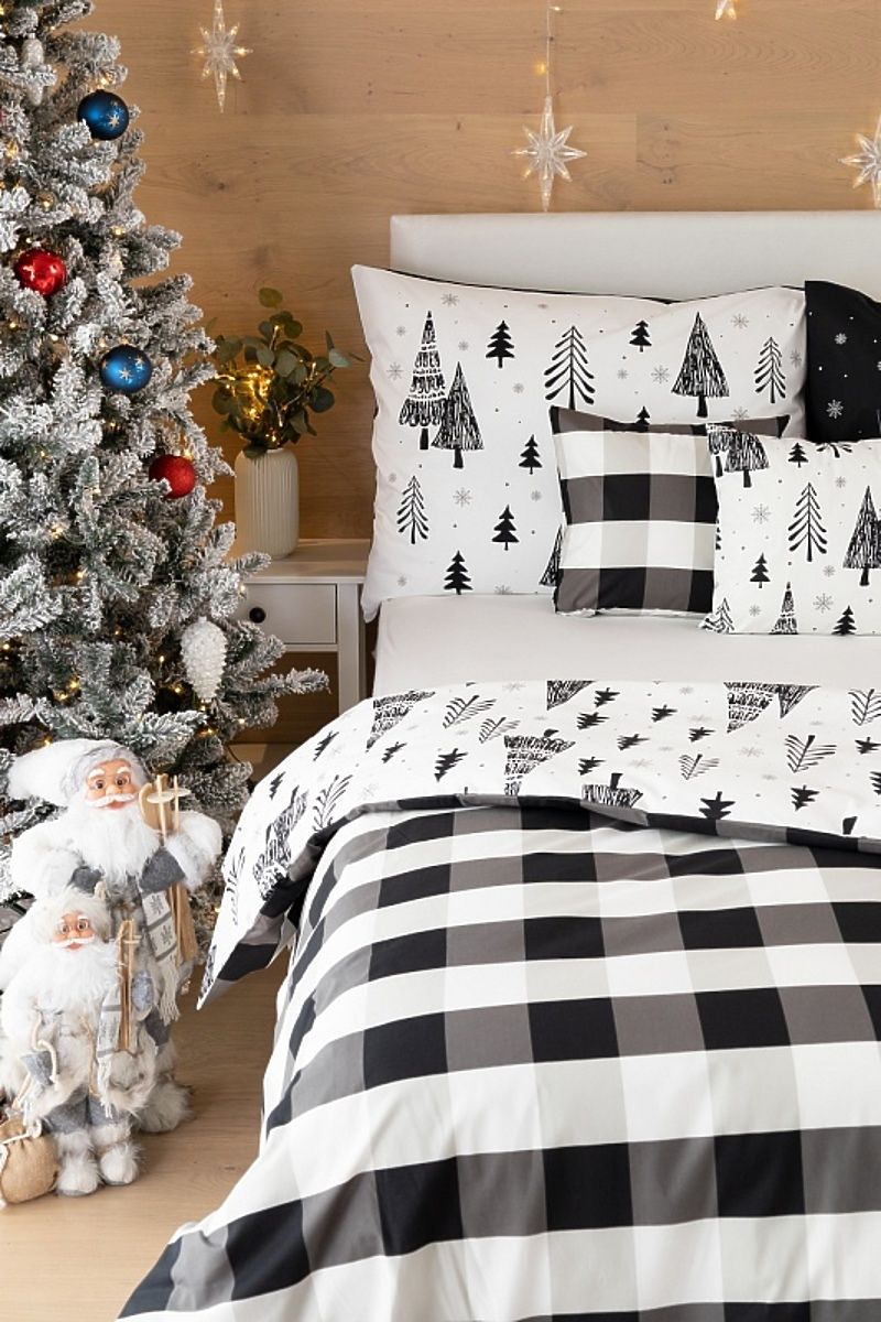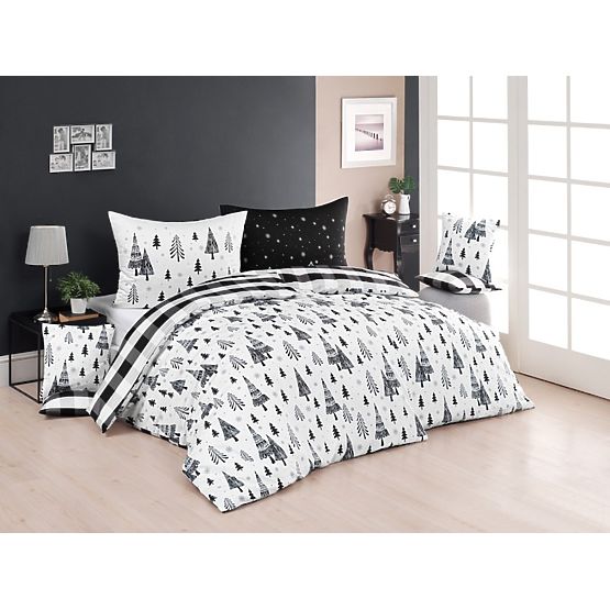 Krásné oboustranné černobílé povlečení s vánočním motivem stromečků. Povlak na přikrývku má na jedné straně různě velké stromky, drobné sněhové vločky a malé puntíky. Druhá strana povlaku je šedo-černo-bílé káro. Povlak na polštář je z každé strany jiný - z jedné strany je posetý stromečkama a druhé strana je černá s bílými sněhovými vločkami. Povlečení se zapíná na zip.