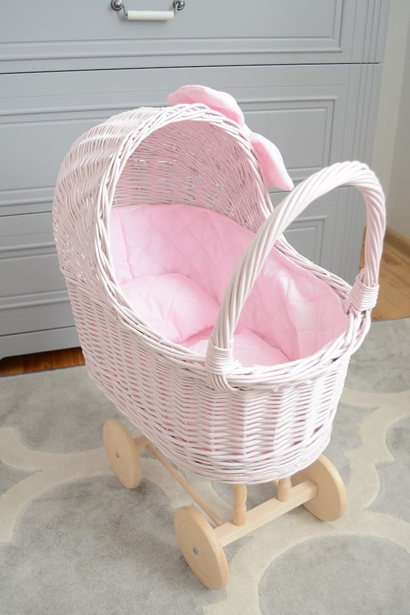 Roztomilý kočárek pro panenky v růžové barvě. Být malou maminkou je splněný sen každé malé slečny. Krásná a praktická hračka, která nemůže chybět při žádné hře na rodinku. Jedinečný kočárek s krásnou prošívanou mašlí bude nejen skvělou hračkou ale i dokonalým doplňkem do pokojíčku. Dřevěná kola dodávají kočárku jedinečný retro vzhled.