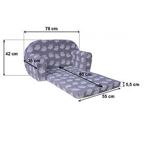 Pohovka po rozložení měří až 80 cm a je navržená tak, aby se na ni pohodlně usadily 2 děti. Vhodná bude nejen do dětského pokoje, ale také do školek nebo dětských koutků.