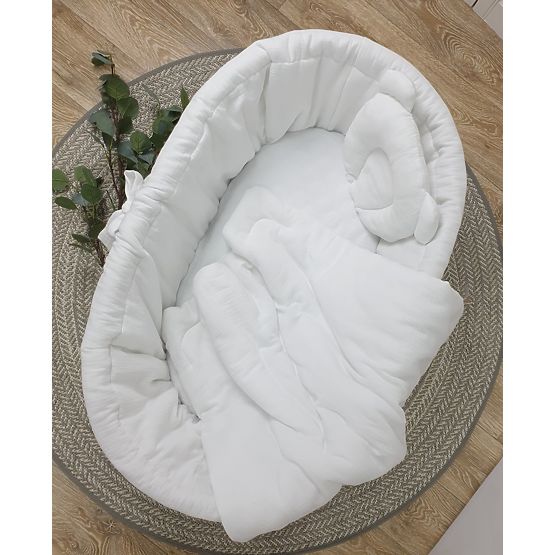 Krásná 4 dílná sada povlečení do proutěné postýlky vyrobena z měkoučkého bavlněného mušelínu. Dětská pokožka je jemná a citlivá, a proto každý rodič, vybírá pro své děťátko jen to nejlepší. Tato sada je dokonalou volbou pro spánek vašich maličkých. Neutrální bílá barva se hodí jak pro holčičky, tak pro chlapečky.