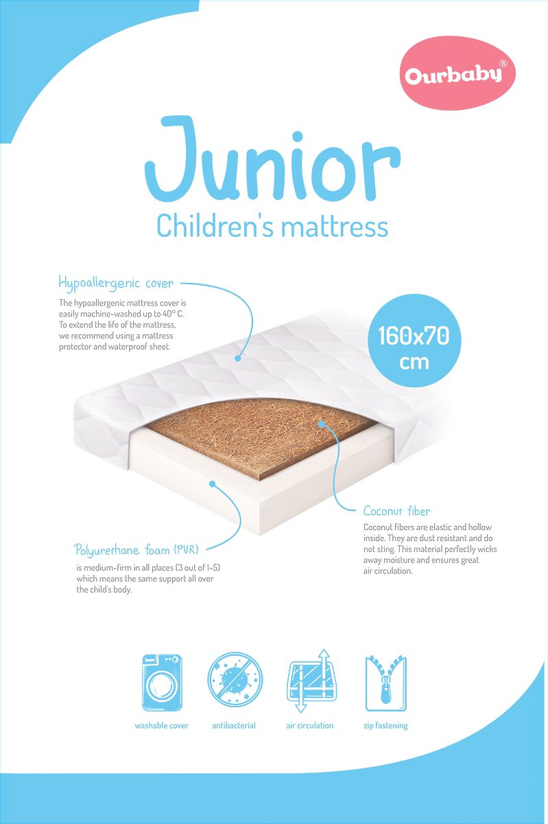 Řada dětských matrací JUNIOR: Oboustranné matrace dvojí tvrdosti. Z jedné strany kokos, z druhé strany polyuretanová pěna. Jednoduše "POLOKOKOS". Nejoblíbenější řada matrací Ourbaby.