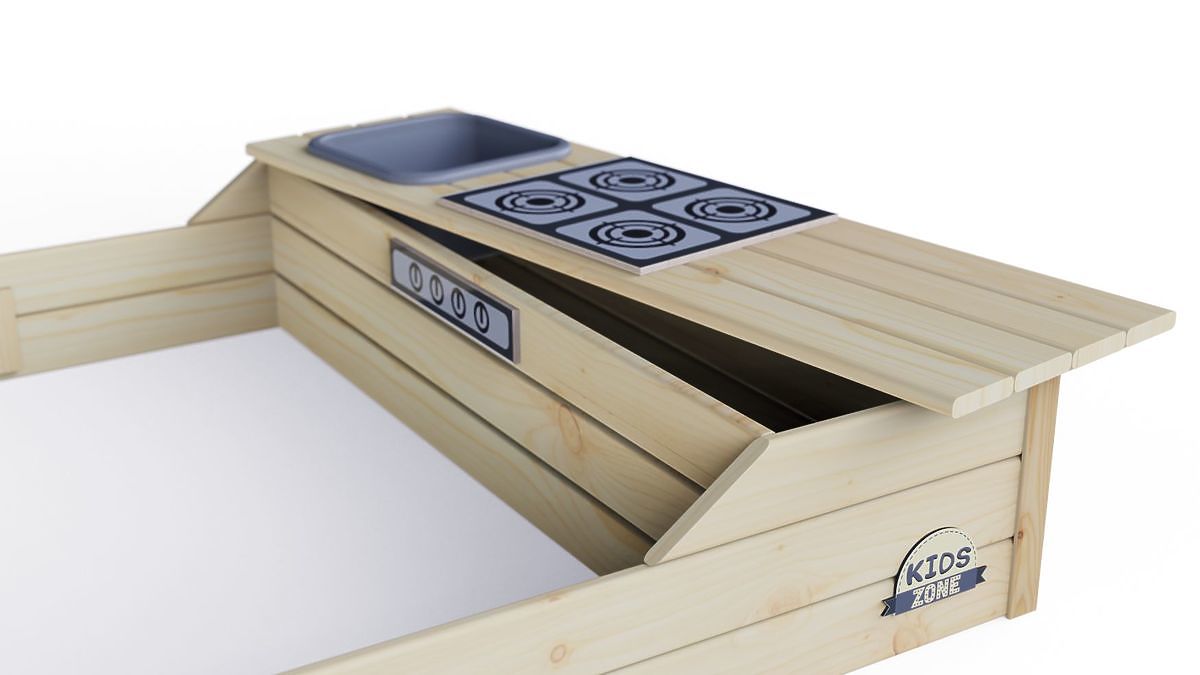 Představujeme Vám pískoviště kombinované s kuchyňkou. Můžete si být jisti, že se Vaše dítě při hře s pískem nudit nebude. Pískoviště má otevírací truhlu, ve které si najde své místečko každá lopatka, kbelík a jiné hračky. Pohyblivá lavice Vám umožní nastavit vhodnou vzdálenost pro každé dítě vzhledem k desce stolu.