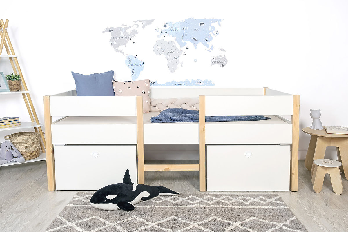 Využijte prostor na maximum. Díky své vyvýšené konstrukci nabízí postel mnoho praktického a úložného prostoru pod postelí. Můžete využít na uskladnění lůžkovin, hraček nebo knih. Postel má lamelový rošt z masivu. Je dodávána bez matrace. Možnost varianty s nebo bez úložných boxů.