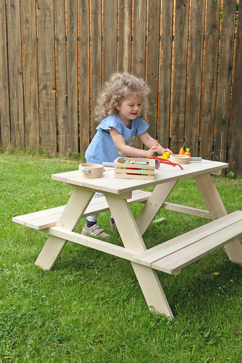 Jedná se o mini verzi zahradního piknikového stolu pro děti. Set je vyrobeny z vysoce kvalitního borovicového dřeva. Tento piknikový stůl bude pro Vaše děti na zahradě nepostradatelný a užijí si u něj mnoho zábavy s kamarády.