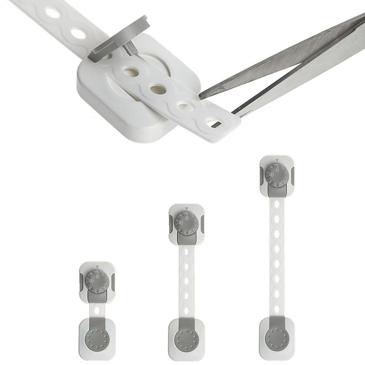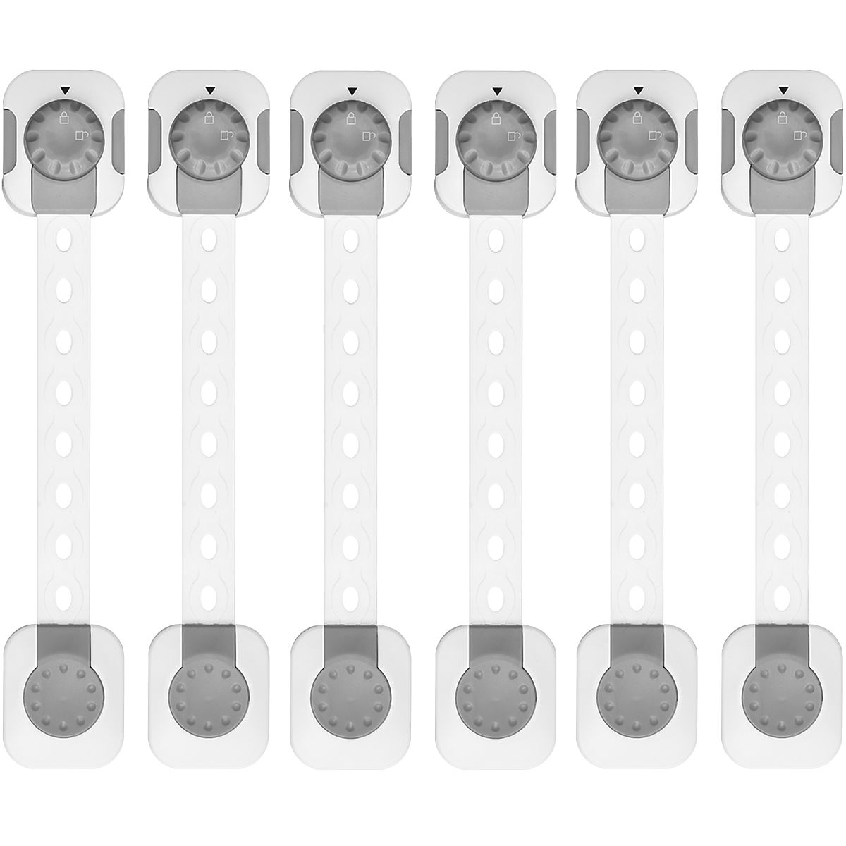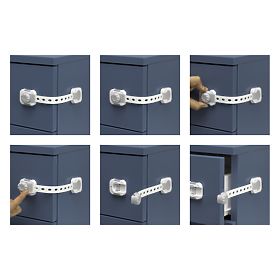 Sada 6 kusů nastavitelných zámků na skřínky a zásuvky s funkcí snadného zamykání, které zajistí rychlý přístup pro dospělé, ale ochrání před otevřením malými dětmi.