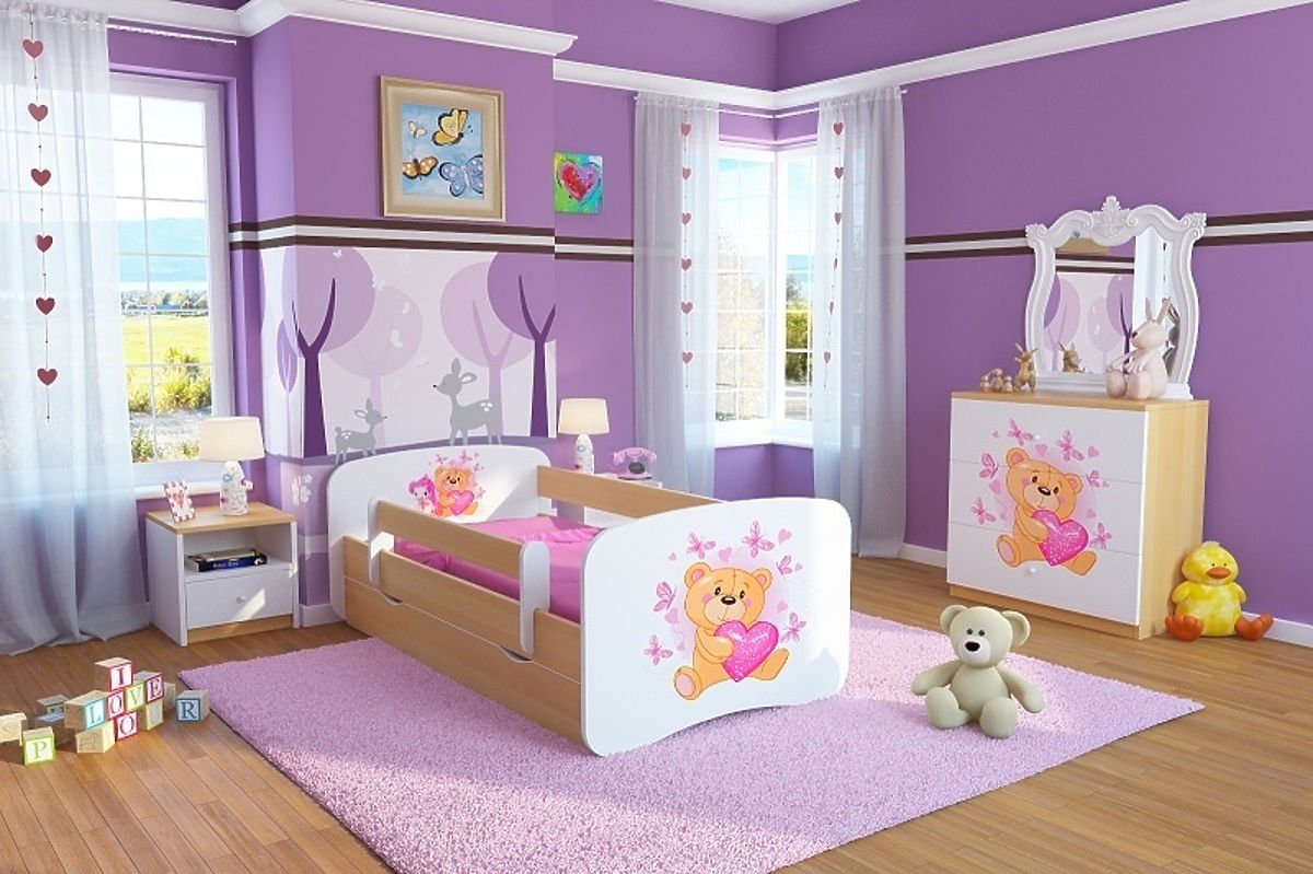 Dětská postel Ourbaby s medvídkem a bukovým odstínem bočnic udělá radost každé malé princezně.