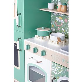 Zelená kuchyňka Esmeraldia s květinovým vzorem zaujme malé i velké kuchtíky svým bohatým příslušenstvím a také originálním vzhledem ve Vintage stylu.