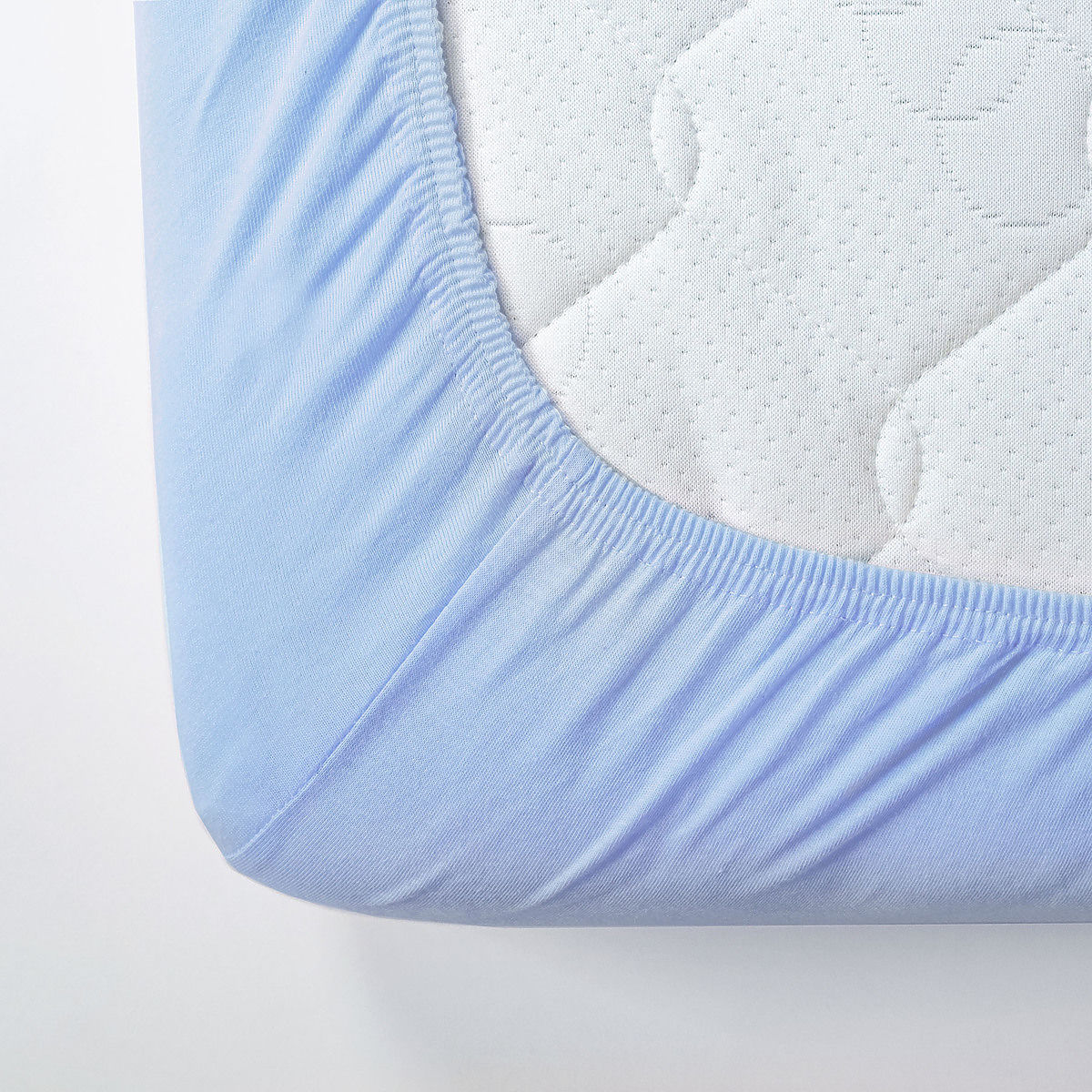 Bavlněné napínací prostěradlo ve světlé modré barvě. Prostěradlo je utkáno z kvalitních bavlněných přízí, a proto si zachovává své vlastnosti i při opakovaném praní.
