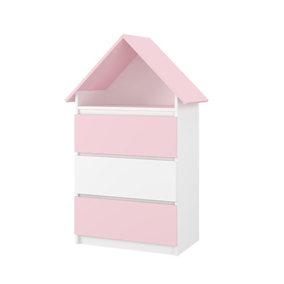 Domečková komoda Sofie je vyrobena z kvalitního lamina v jemných odstínech růžové a bílé barvy. Tento pastelový odstín dodává komodě lehkost a šarm, což ji činí ideálním doplňkem do holčičích pokojíčků. Na vrcholu komody najdete zakončení střechy, což dodává celému designu domečku zvláštní útulnost a kouzlo. Její neodolatelný design ve formě domečku přináší do vašeho domova hravou atmosféru a zároveň poskytuje praktické úložné řešení.