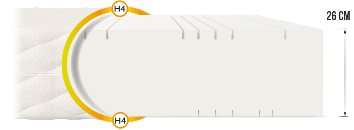 Pěna má nestejnoměrnou buněčnou strukturu, díky níž dosahuje lepší opory těla, pohodlí a pružnosti. Matrace se dokonale přizpůsobí tvaru těla a přitom zůstává velmi lehká. Materiál je mimořádně trvanlivý a odolný proti deformacím. Pórovitá struktura umožňuje dokonalou cirkulaci vzduchu, což zabraňuje vzniku hub a plísní. Obrysově řezaná rovina ve formě mřížky se vyznačuje ortopedickými vlastnostmi.