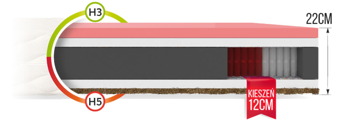 Pružiny jsou vyrobeny technologií NanoHard, která zaručuje pevnost a prodlužuje životnost. Druhá vrstva je odolná a pružná pur pěna, která poskytuje dobré odpružení těla a kvalitní oporu páteře. Vaše tělo se tak dokonale přizpůsobí matraci a ráno se probudíte odpočatí a svěží. Dále pak termoplastická pěna VISCO zajišťuje bezkonkurenční komfort a pohodlí díky tvarové paměti. Dokonale mapuje tělo a později se vrací do původního stavu. Pro zajištění dodatečné prodyšnosti byla použita kokosová vložka, která jako přírodní materiál mírně zpevňuje celou konstrukci. Mezi pružiny a pěnu byl vložen oddělující materiál. Jedná se o přírodní plsť, která může výrazně prodloužit životnost matrace a posílit její konstrukci.