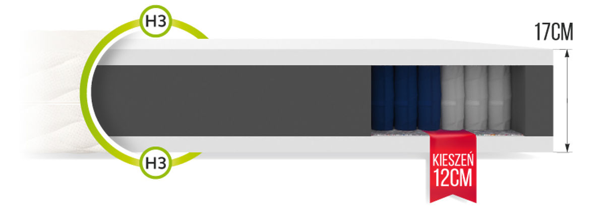 Oboustranná matrace TREVISO o výšce 17 cm je klasickým modelem taštičkové matrace. Jejím základem je kapsová forma. Taštičkové pružiny byly vyrobeny technologií NanoHARD a díky dvakrát tvrzenému drátu se výrazně prodlužuje jejich životnost. Matrace se vyznačuje 7 zónami s různou tvrdostí, což zajišťuje ergonomickou polohu těla během odpočinku. Pružiny pracují nezávisle na sobě, což eliminuje efekt ohýbání velké plochy matrace při tlaku na její malou část. Díky tomu nepocítíte žádné otáčení či vrtění druhé osoby, což zajistí hluboký a ničím nerušený spánek. Kapsová vložka je obklopena pur pěnou T25, která má vysokou odolnost proti deformaci, je pružná, dobře prodyšná a stabilizuje tělo během odpočinku. Mezi pružiny a pěnu byl vložen oddělující materiál. Jedná se o přírodní plsť, která může výrazně prodloužit životnost matrace a posílit její konstrukci.