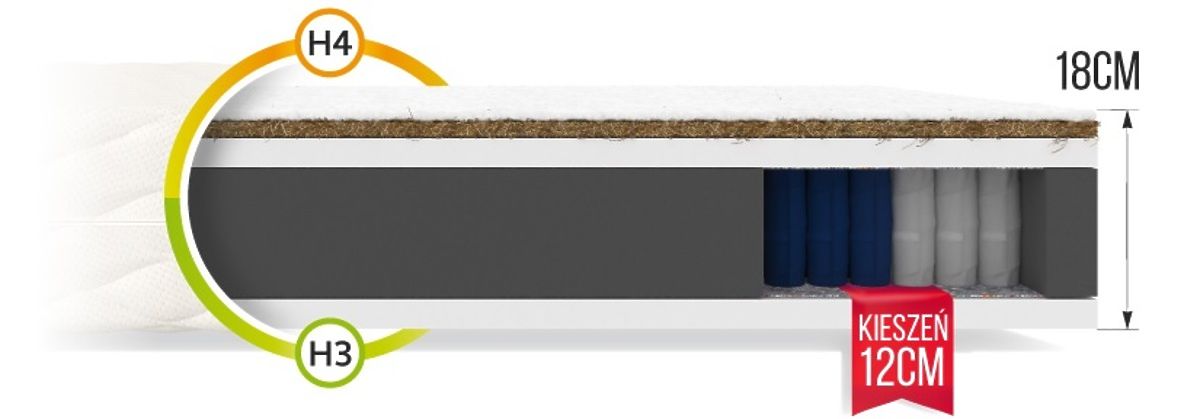 Jádro matrace tvoří taštičkové pružiny, kde každá je umístěna ve speciální kapse. Pružiny nejsou vzájemně propojeny a při zátěži pracují samostatně. Svým tvarem se přizpůsobí postavě spící osoby a poskytují tak vynikající oporu páteři. Matrace je rozdělena na 7 opěrných zón, kde každá zóna představuje adekvátní oporu pro danou část těla. FAMILY je oboustranný model díky různým stupňům tvrdosti z každé strany matrace, takže se snadno přizpůsobí vašim osobním preferencím. Jednu stranu matrace tvoří pur pěna a kokosová vložka a z druhé strany se nachází vrstva pur pěny. Pružná pěna je odolná proti deformaci a zabraňuje rozvoji roztočů a jiných mikroorganismů. Přírodní kokos je zas prodyšný a má antialergické vlastnosti. Mezi pružiny a pěnu byl vložen oddělující materiál. Jedná se o přírodní plsť, která může výrazně prodloužit životnost matrace a posílit její konstrukci. Použité materiály jsou bezpečné, trvanlivé a odolné proti opotřebení. V důsledku toho bude matrace FAMILY sloužit mnoho let.