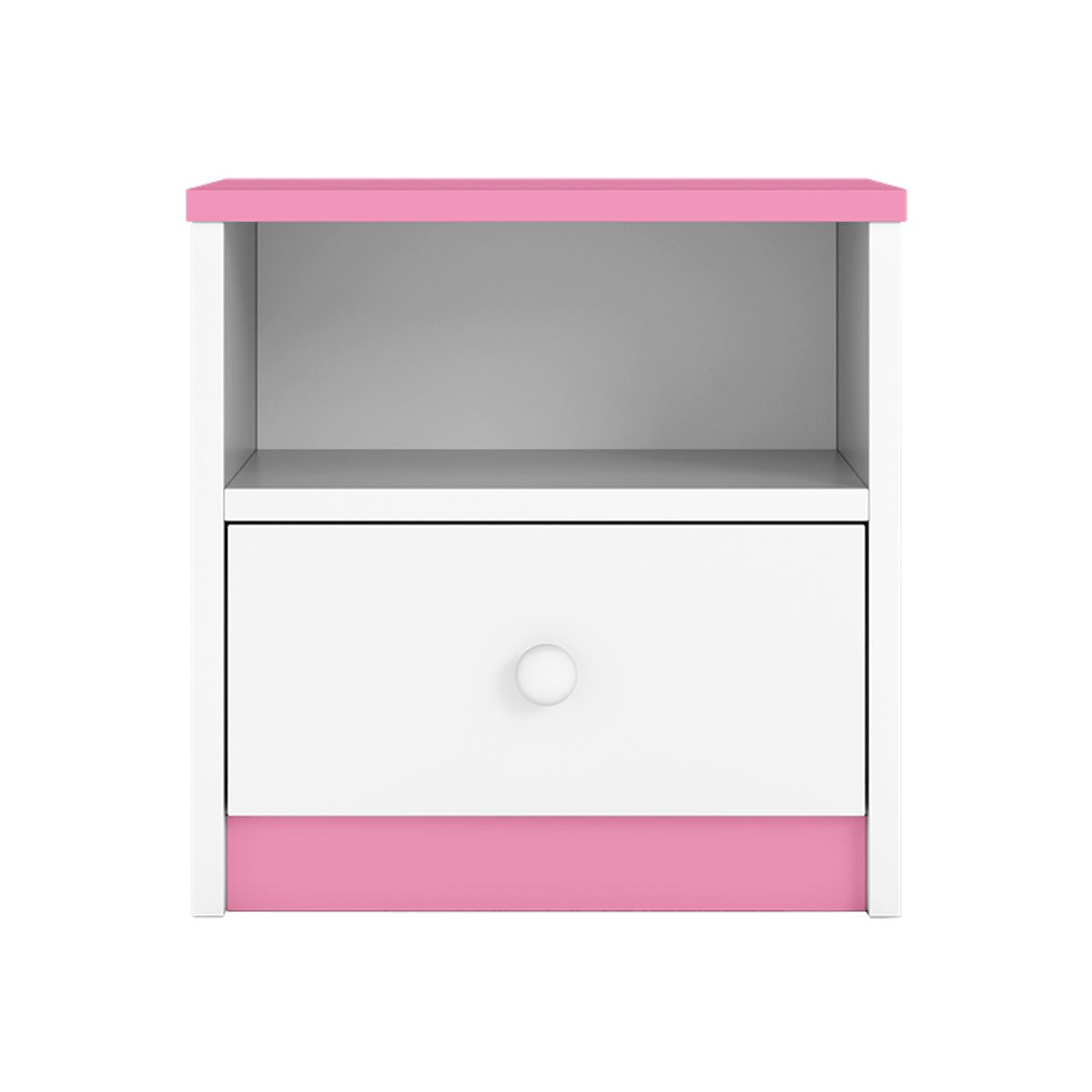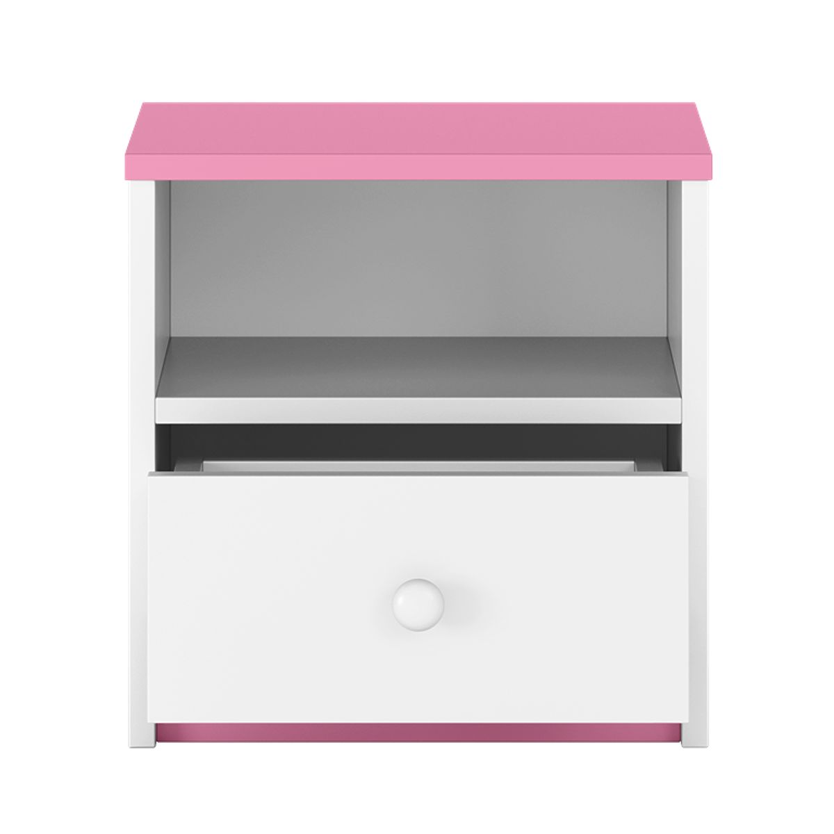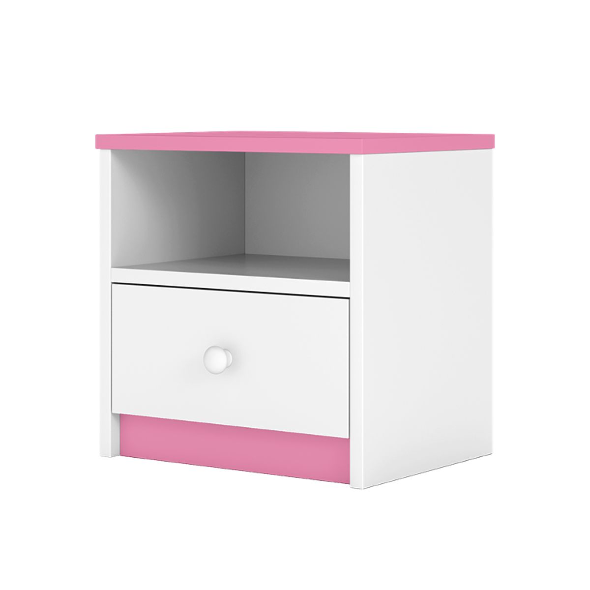 Dětský noční stolek Ourbaby v růžovo-bílém provedení. Pokud zkombinujete stoleček s postelí a komodou Ourbaby, vytvoříte krásný nábytkový set.