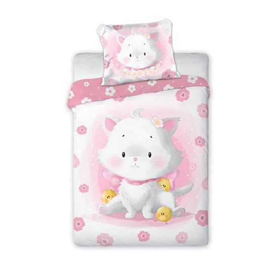 Něžné bavlněné povlečení s roztomilým motivem koťátka se bude krásně vyjímat v každé holčičí postýlce. Povlečení v jemných růžovo-bílých tónech je vyrobeno z kvalitní 100% bavlny, která je na dotek velmi příjemná, prodyšná a nedráždí citlivou dětskou pokožku. Barvy potisku se vyznačují sytostí, kterou si zachovávají i po mnoha vypráních.