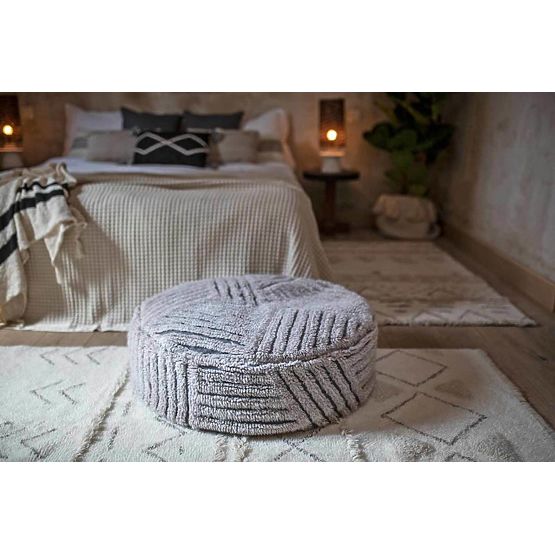 Kulatý vlněný pouf od španělské značky Lorena Canals na bázi bavlněného plátna barveného uhlím a designem inspirovaným polem v měkkých barvách Sea shell a .. více