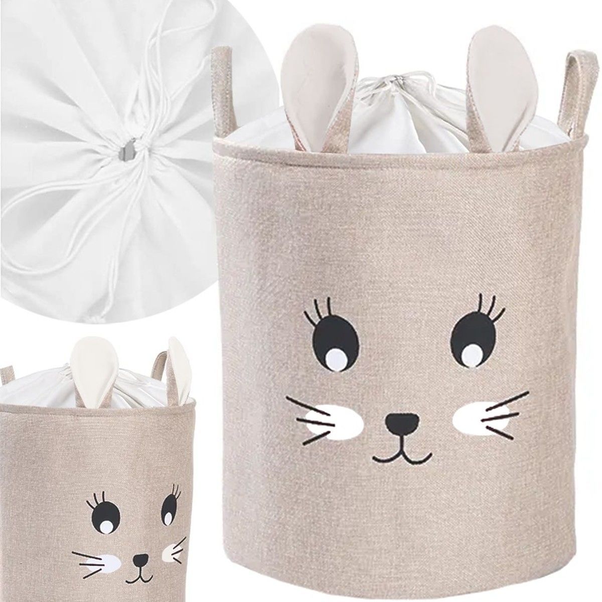 Velký béžový koš s motivem roztomilého králíčka je skvělým pomocníkem nejen při úklidu hraček v pokojíčku, ale díky speciální voděodolné vrstvě najde uplatnění i v koupelně a prádelně.