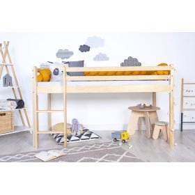 Vyvýšená postel je vyrobena z borovicového masivu bez barevného nátěru. Přirozený vzhled dřevěného dekoru borovice je krásný na pohled. Zároveň je postel stabilní a bezpečná.