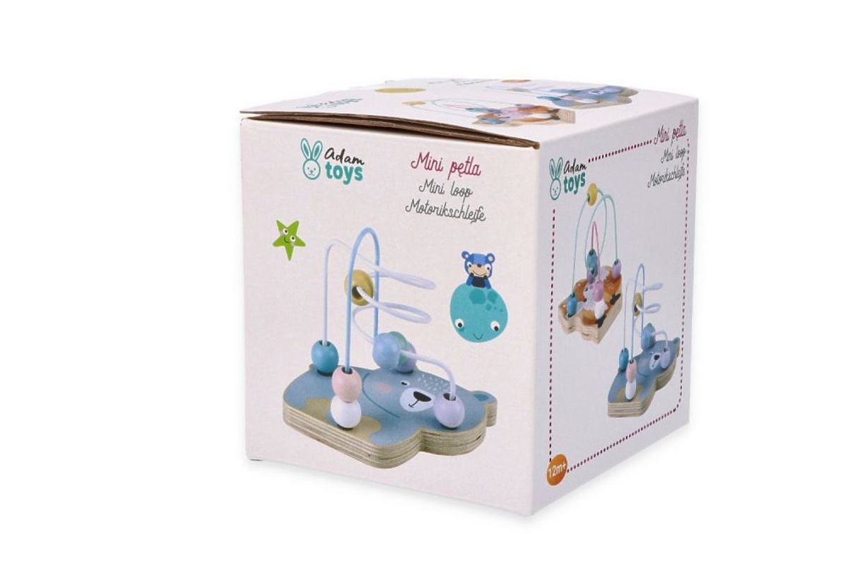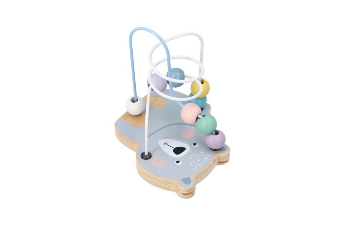 Hračka se skládá z podstavce s vyobrazením Medvídka, 2 kovových drátků ohnutých tak, že tvoří smyčky, a na každém drátku jsou 4 dřevěné korálky. Celé je to zabaleno v estetické krabičce, ideální jako dárek.