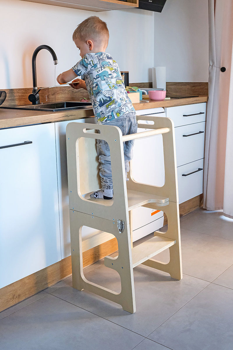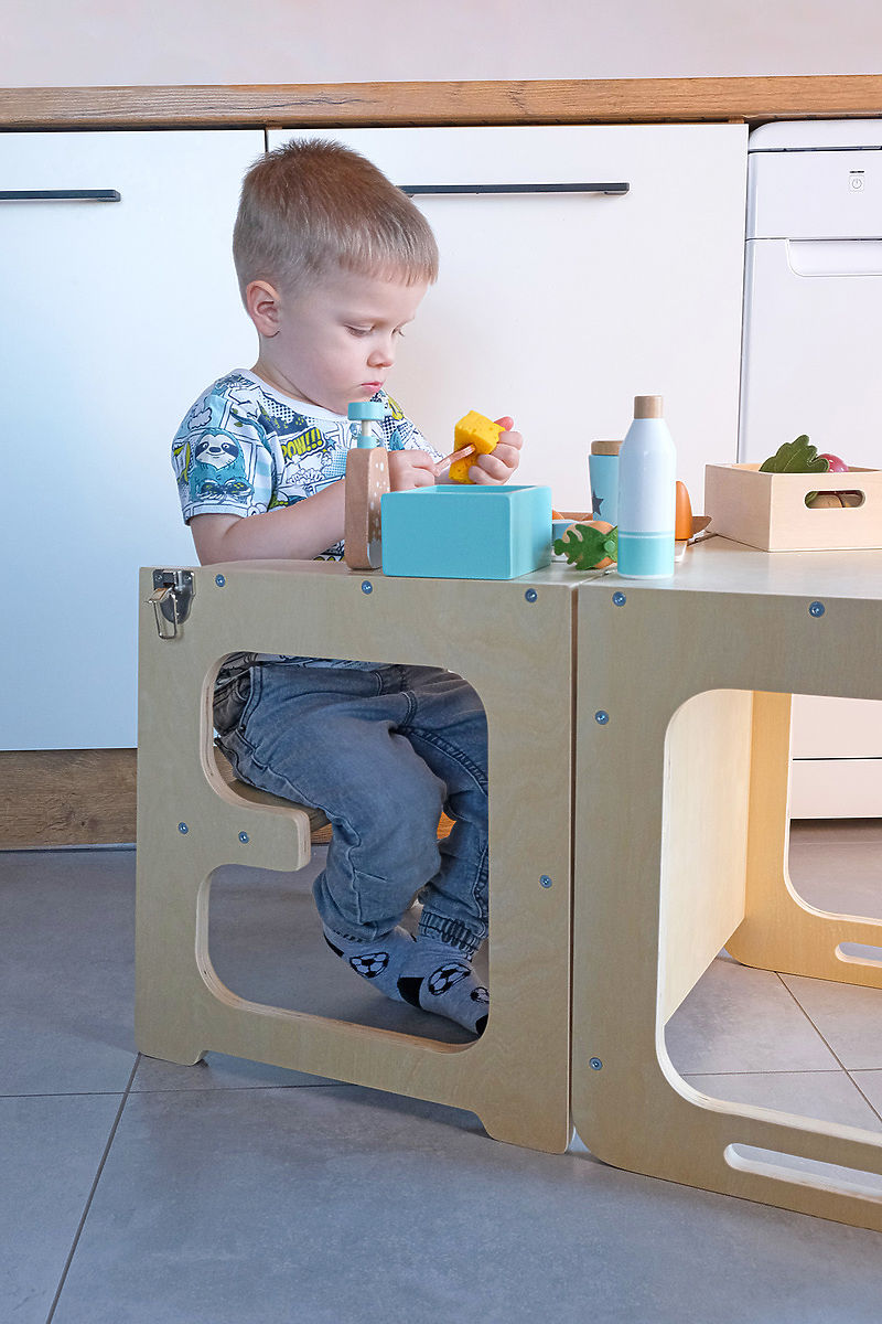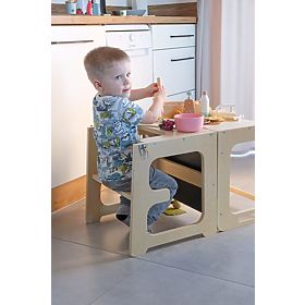 Tato učící věž je nejen zábavná, ale také multifunkční - lze ji snadno proměnit na praktický stoleček a židličku. Vytvoříte tak bezpečné místo na stolování, hraní či tvoření. Součástí věže je také tabule na kreslení.