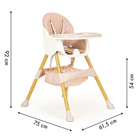 ŽIDLIČKA 2v1Židlička má možnost změny výšky. Snadno můžete demontovat nohy a podnožku, díky čemuž z vysoké židličky vznikne nižší židlička. Pokud se vaše dítě stává samostatným a nemusíte ho již pečlivě sledovat při jídle, nižší židlička bude pro něj ideální.