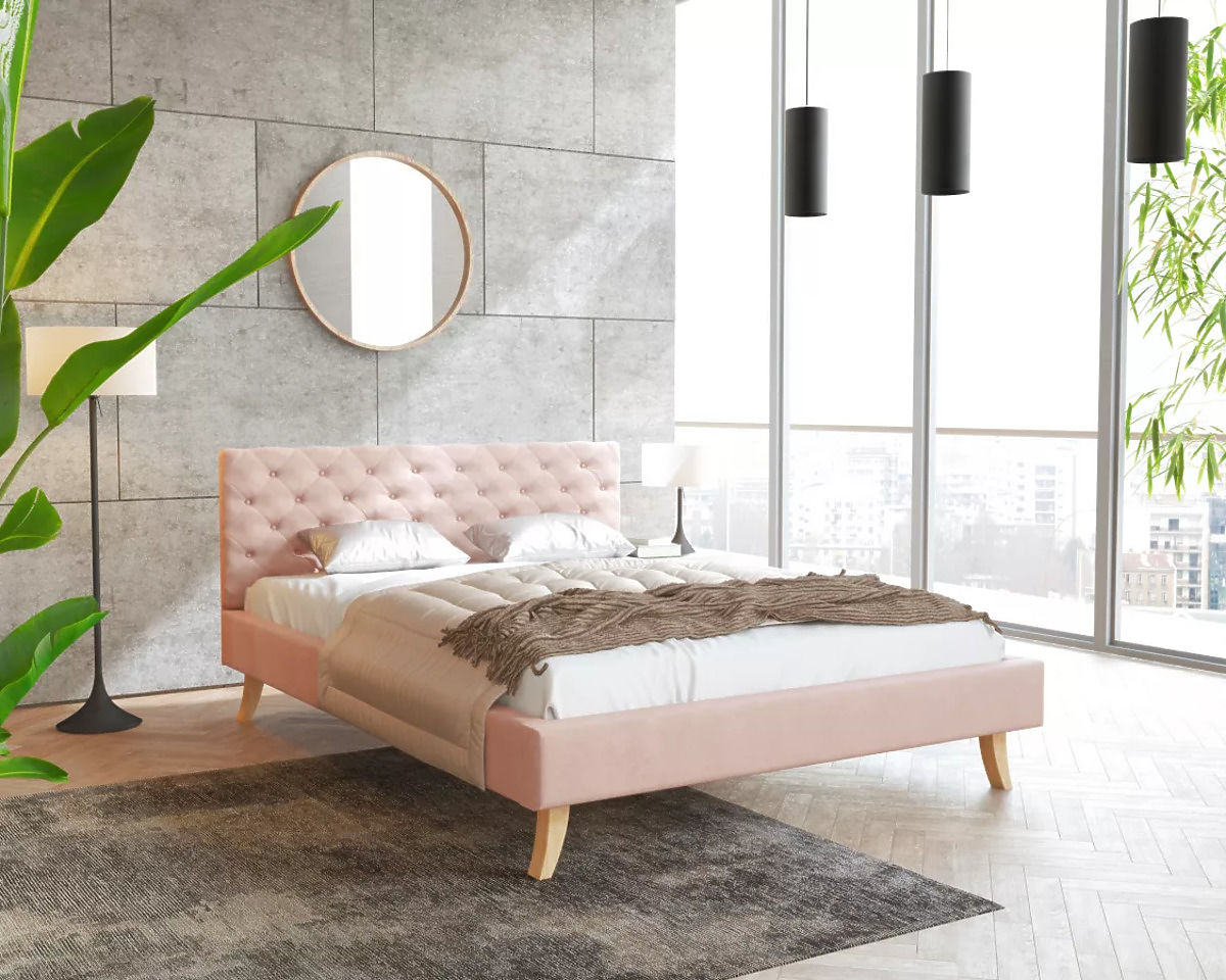 Potahovým materiálem čalouněné postele je pudrově růžová velurová látka Trinity. Vyznačuje se jemnou strukturou a zároveň vysokou odolností i proti slunečnímu záření. Je měkká, nadýchaná a příjemná na dotek. Rovněž je velmi odolná proti oděru a žmolkování. Zaujme vás svým moderním vzhledem a ozdobným prošíváním čela postele.
