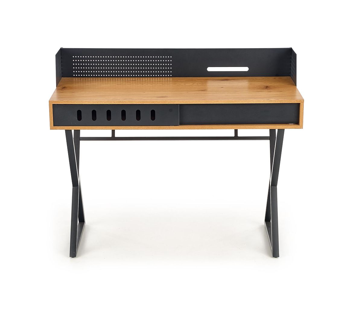 Moderní psací stůl s elegantním designem, který kombinuje zlatý dub a černou barvu. Je vyroben z dýhované MDF a práškově lakované oceli, což zajišťuje vysokou kvalitu a odolnost. Ideální pro domácí kancelář nebo pracovní kout.
